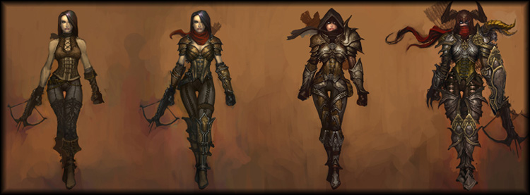 All'inizio, il Demon Hunter (Cacciatore di Demoni, ndt) non era neanche umano. Alla nascita questo personaggio era un demone in tutto e per tutto, e più recentemente, un ibrido demone/umano. Ora, con la versione rilasciata al pubblico, il Demon Hunter è completamente umano. Con un pizzico di look medievale a caratterizzarne l'aspetto, e una sciarpa corredata di una protezione per le braccia in tutti i modelli mostratici.