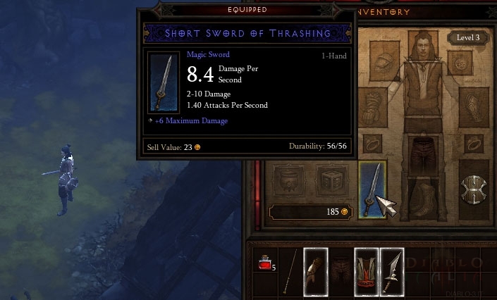 Ma non è durato molto, ahimè. Ho trovato la mia prima arma blu quando sono arrivato a Nuova Tristram. Potete vederla sulla destra; solo una spada corta con qualche incremento ai danni, ma per il mio Wizard era praticamente un deciso incremento del danno rispetto a quel 1-2 dmg della mia bacchetta iniziale. Non solo il danno era migliorato, ma anche la velocità degli incantesimi: e di molto, il 33% o più, e improvvisamente gli stessi mostri che sfidavano i miei MM cadevano di fronte a me in poco tempo (e con meno MM). La difficoltà è salita un po' quando sono entrato al livello 1 della Cattedrale, e direi che è stato più divertente lì che in tutto il resto del tempo. (Questo livello si presenta in modo molto diverso da come lo avevo visto prima, ed ero emozionato per la novità, ma poi gli altri livelli della cattedrale sono rimasti gli stessi di sempre). In quel momento ho raggiunto il livello 6, quindi ho aggiunto Arcane Orb, e nonostante fossi momentaneamente terrificato dal suo danno molto basso (facevo circa 8-9 danni con MM e 17-21 con l'Orb), ho presto scoperto che la potenza di impatto dell'AoE compensava il tutto. Penso che gli Arcane Orb garantiscano un attacco più veloce rispetto a prima. Non ci giurerei, ma in ogni caso possono colpire 5 o 6 mostri per volta, e ognuno di essi subisce danno completo, vicino al doppio del danno del MM: una grossa differenza. Non tanto per i singoli mostri, ma contro un vasto gruppo è spettacolare. Anche con un costo di 35 PA, non ho avuto molti problemi: aspettavo che i mostri si raggruppassero, ne uccidevo 4 o 5 con un singolo Arcane Orb, e poi usavo MM per finire qualche sopravvissuto. Come ho detto prima, penso che il PA si rigeneri più velocemente. Sembrava almeno fosse così, e avevo oggetti con nuovi mod. Uno dei miei pezzi di armatura aveva +1 al PA per uccisione, che non avevo mai visto prima; come si dice in banca, aggiungere un po' di qua e un po' di là fa la differenza nel tempo.