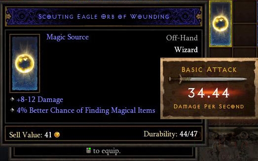 Inoltre, se scegliete di usare un Orb, ogni Orb del Mago (come i Mojo per lo Sciamano) fornisce un danno aggiuntivo. Quindi se la vostra mano principale fa 8-10 danni a 1.4 di velocità, e l'orb aggiunge 3-4 danni, questo significa che state facendo 11-14 danni a 1.4.