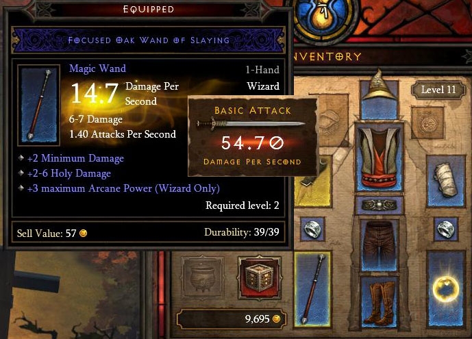 La parte più difficile e strategica è durata più o meno fino al livello 8; a questo punto sono riuscito ad aggiornare il Fabbro abbastanza da avere disponibile gli schemi per una Bacchetta d'Apprendista. Ne ho fatta una, più una spada a due mani per confrontarle. La bacchetta faceva circa 11 punti danno, mentre la spada 16. In più, con il mio cappello, assomigliavo a Gandalf... per circa 5 minuti. Dopo di che ho trovato un orb che aggiungeva +8-12 al danno, e con questo il danno a una mano della mia nuova bacchetta superava quello della spada a due mani. Proprio come Wyatt ha detto che sarebbe stato!