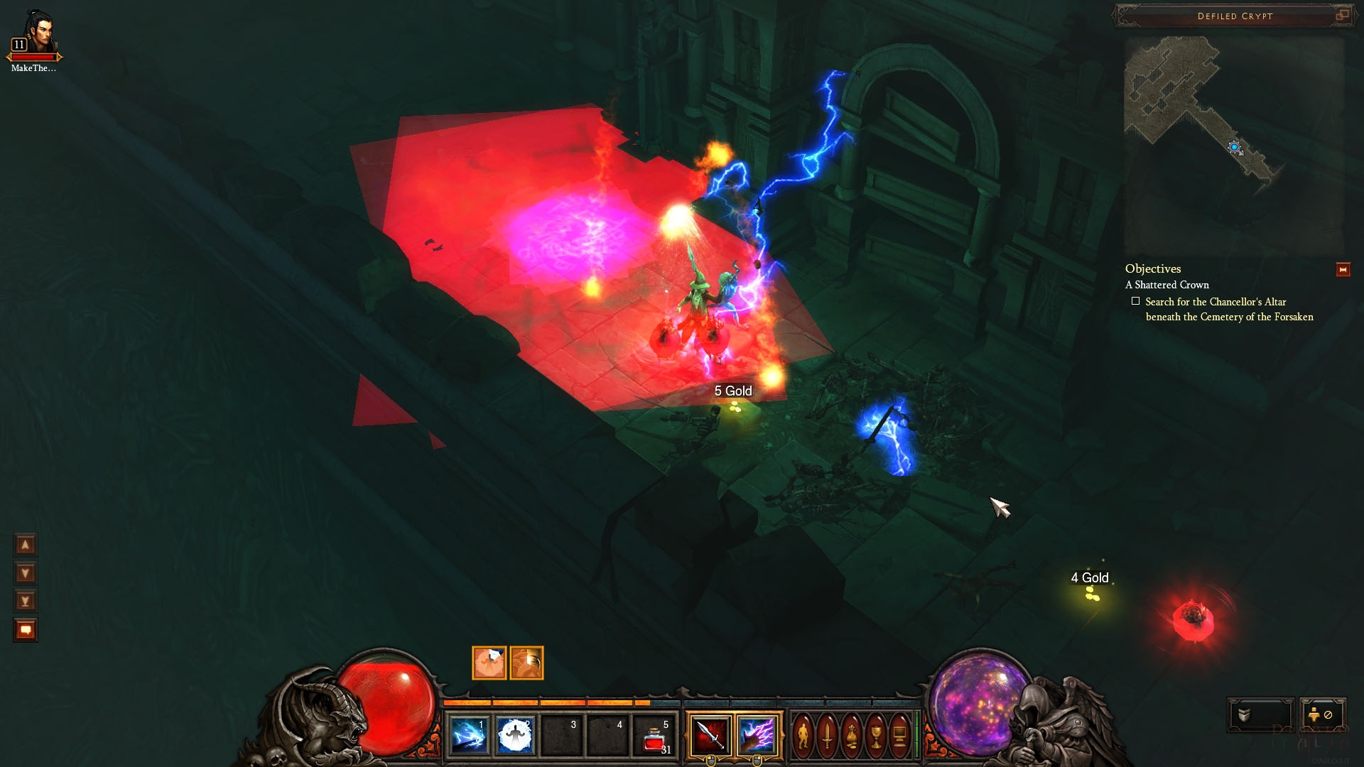 Un'altra abilità dei boss è Electrified. Le "patch notes" dicono che avrebbero ridotto il danno dei fulmini del 40%, ma penso siano molto più pericolosi rispetto a prima. Sono stato contro questa abilità dei boss in Diablo 3, poiché Lightning Enchanted era così brutta in Diablo 2, e ancora in D3 la versione di quei nemici è praticamente innocua. Prima non bisognava sforzarsi particolarmente per rimanere fuori dalla portata dei fulmini, anche quando si presentavano a tonnellate; adesso le catene di fulmini sembrano fare più danni, ed evitarli è diventato fondamentale. Con dozzine di pop-up di danno rossi da "-3", la faccenda inizia a farsi pericolosa. Forse fanno meno danno a colpo, ma le catene si presentano in aree più vaste, quindi è più facile capire quando si è nei guai e modificare la propria strategia, spesso arretrando.