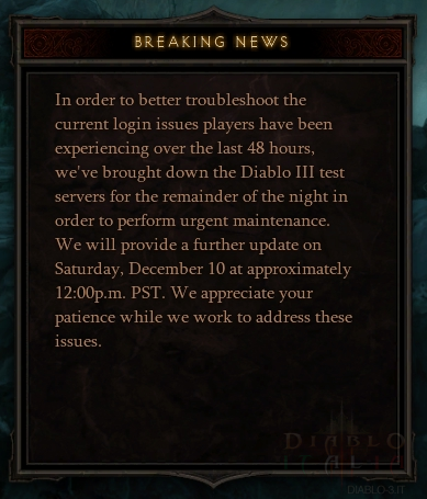 Al fine di risolvere al meglio i problemi di accesso attuali che i giocatori hanno sperimentato nelle ultime 48 ore, abbiamo "messo off-line" i server di prova di Diablo III per il resto della notte al fine di eseguire la manutenzione urgente. Vi forniremo un ulteriore aggiornamento sabato 10 dicembre intorno alle 12:00 p.m. PST. (le nostre ore 18.00 GMT NdLord Soth).
