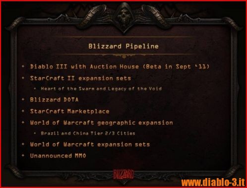 completare la prima espansione per Diablo 3 entro tre anni. Tre anni sono un periodo piuttosto lungo di attesa per un'espansione; speriamo che le RMAH e l'economia riescano a tenere i giocatori incollati al gioco fino all'uscita. Le Case d'Asta stanno richiedendo più tempo del previsto per essere testate e ottimizzate, e forse potrebbero non essere incluse subito al momento del rilascio.