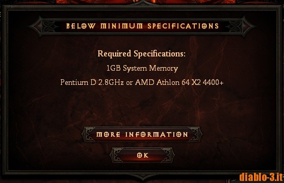 Per una lista più esaustiva delle schede video supportate o meno dal client beta, potete fare riferimento al nostro forum, dove è già attiva una discussione con l'intera lista.Anche se non abbiamo ancora una conferma ufficiale in merito ai requisiti minimi, il client beta si dimostra in linea con quelli di StarCraft 2, come potete notare dall'immagine qui sotto, inviata da un lettore di diablo.incgamers.com che possiede un PC con specifiche ovviamente non sufficienti a far girare l'applicazione.
