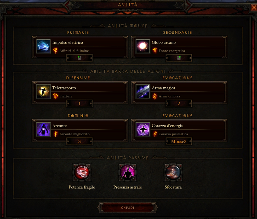 Potenza Fragile è un'abilità passiva che aumenta del 15% i danni inferti a discapito del 10% in meno di armatura e resistenze. Per questo motivo, per compensare, ho ritenuto necessario, invece di utilizzare un'abilità che ho sempre ritenuto utile come Sigillo Stimolante, utilizzare Sfocatura, un'abilità che riduce del 20% i danni da mischia subiti. Ed è questa abilità, a mio parere, che permette al mago di resistere un po' più del solito in mischia e facilita l'uso di Arconte nel caso si sbaglino di poco le tempistiche di gioco. L'ultimo sguardo ricade su Potenza Astrale: mi è sempre dispiaciuto sacrificare Fonte Arcana per utilizzare Corazza Prismatica, e a meno che un mago non sia fortunato da trovare la bacchetta del secolo che aumenta anche il potere arcano e magari lo rigenera, questa abilità si rende utile in quanto permette al mago di ripristinare più velocemente le sue risorse, consentendo di lanciare fino a 5 Globi Arcani in una volta, il che mi sembra un buon traguardo.