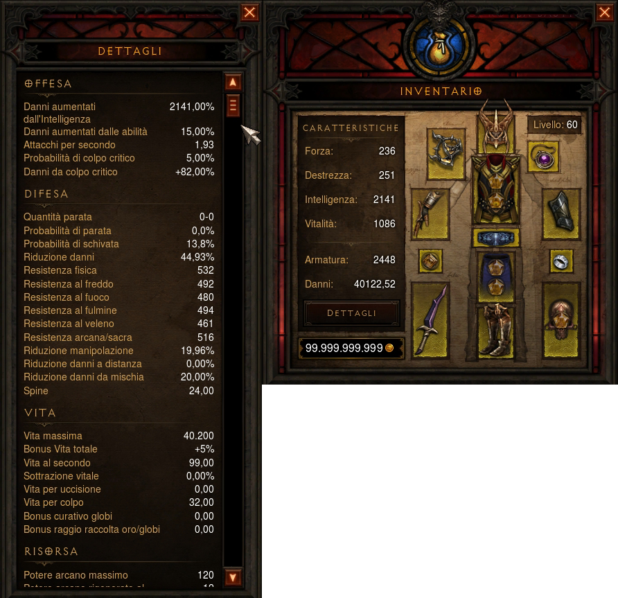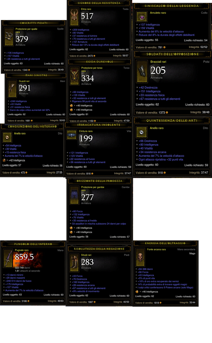 Noterete che il mio mago ha un ampio margine di miglioramento: per esempio, gli anelli non presentano resistenze e hanno poco danno da critico, le spalline hanno resistenze alquanto basse... Sono curioso di scoprire come si comporterà questa build con un equipaggiamento migliore.