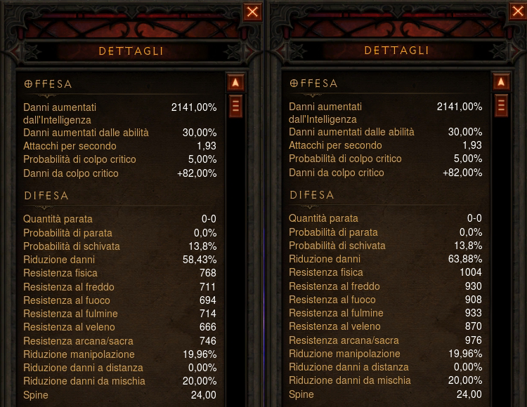 Corazza d'Energia: noterete dalla scheda del personaggio e dalla scheda abilità che ho deciso di togliere l'abilità passiva Sigillo Stimolante, che raddoppia la durata di Corazza e permette un maggiore ripristino vita al secondo. Ebbene, l'abilità Corazza d'Energia, con la runa Corazza Prismatica, è un'altra abilità fondamentale a mio parere per il mago; non credete di andare molto lontano con le resistenze che avete letto sopra. Inoltre, se volete utilizzare Arconte, questa abilità è fondamentale, in quanto vi consente di rimanere fermi un po' di più senza subire troppi danni. Ecco in dettaglio le resistenze del mio mago con Corazza Prismatica e con Arconte attivato (ricordo che in modalità Arconte le resistenze aumentano ancora di più):