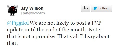 @piggilol non siamo in condizione di postare un aggiornamento sul PvP fino alla fine del mese. Nota: questa non è una promessa. È tutto ciò che posso dirvi.