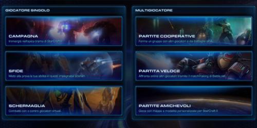 Il pulsante StarCraft riunisce le modalità di gioco di StarCraft II in un unico posto. In questo menu troverai le opzioni multigiocatore competitive e cooperative che conosci già, tra cui Partita veloce, Cooperativa, Partite a squadre, Gioco a squadre e partite personalizzate. Troverai anche l'opzione della campagna per giocatore singolo, Sfide e partite Vs. IA.