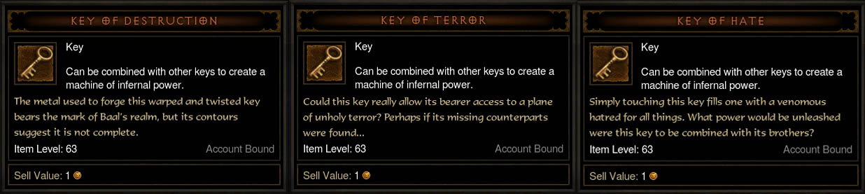 Come già visto nell'articolo sui contenuti PTR della Macchina Infernale, sarà necessario trovare le tre chiavi da tre boss differenti per poter forgiare il Congegno Infernale. Qui di seguito vengono mostrate le tre chiavi trovate negli Atti I, II e III.