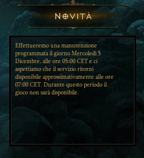 Come ormai da molte settimane ci hanno abituati, Blizzard ha annunciato nella notte di ieri una manutenzione ordinaria di due ore. Ecco l'annuncio dato da Laetzin sui forum ufficiali americani:Effettueremo una manutenzione programmata dei server di gioco di Diablo 3 martedì 4 dicembre. La manutenzione inizierà alle ore 5:00 PST e si prevede che durerà 2 ore. Durante questo periodo Diablo 3 non sarà giocabile. Inoltre, molti servizi web potrebbero non essere disponibili.