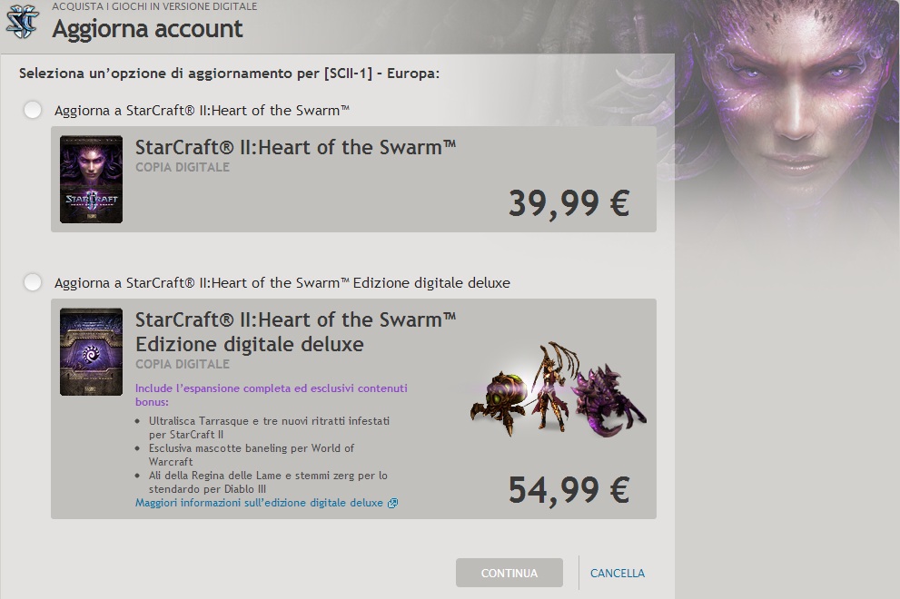 Oltre all’Edizione standard e all’Edizione da collezione, disponibile in esclusiva presso i rivenditori e piena di contenuti bonus, avrai inoltre l’opportunità di aggiornare la tua copia dell’Edizione standard a Edizione digitale deluxe, con tutti i contenuti digitali dell’Edizione da collezione: l’aspetto Tarrasque per le tue Ultralische zerg nel multigiocatore in Heart of the Swarm; ritratti infestati per il tuo profilo di StarCraft II; una mascotte Baneling per i tuoi personaggi di World of Warcraft®; un set di ali zerg e un nuovo stemma per i tuoi eroi di Diablo® III.