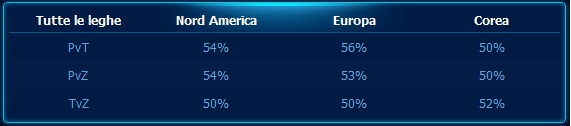 I calcoli non tengono in considerazione le abilità dei giocatori e questi numeri sono in costante cambiamento. Per meglio interpretare questo schema, si tenga conto che un indice di vittoria del 45-55% suggerisce che non c'è segno di disequilibrio. Inoltre, visto che questi numeri cambiano di giorno in giorno, non è strano vedere una razza che prima aveva un indice di vittoria del 54% passare al 46% la settimana successiva. In generale, abbiamo constatato indici di vittoria che variano dal 45% al 55% in ogni combinazione e in ogni regione per diverso tempo.