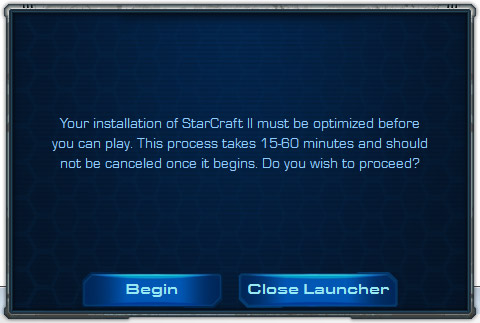 Una volta cliccato su "Sì", la nuova applicazione di lancio di StarCraft II comparirà e chiederà di attendere finché non avrà aggiornato i file di gioco. Il procedimento può richiedere da pochi minuti a un'ora, quindi è importante aspettare che venga portato a termine e non annullarlo, perché questo potrebbe causare problemi con l'installazione della patch.