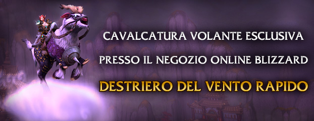 Sali in sella a uno degli animali più rari e maestosi di Pandaria, il Destriero del Vento Rapido: si dice che la buona sorte ti accompagnerà. Sfreccia nei cieli su una nuvola argentea tanto veloce quanto la tua competenza in equitazione ti permette. Acquistala presso il negozio online Blizzard e la cavalcatura potrà essere usata da tutti i tuoi personaggi di World of Warcraft, presenti e futuri, su un singolo account Battle.net®.