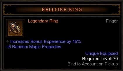 - L'Anello di Fuoco Infernale ha come statistica fissa un bonus del 45% all'esperienza guadagnata, oltre a 6 proprietà casuali. Crearlo costa 50.000 oro.