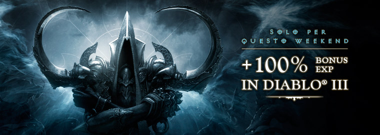 Ci siamo! Il 25 marzo Diablo III: Reaper of Souls™ verrà scatenato su Windows e Mac. Per festeggiare – e solo per questo weekend – raddoppiamo il bonus del 50% all'esperienza già disponibile in Diablo III, portandolo a uno stratosferico +100%!