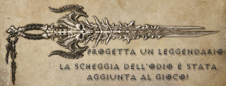 Dopo molti sondaggi e varie fasi di lavorazione in cui noi utenti di Diablo 3 siamo stati chiamati a progettare un pezzo di equipaggiamento, scegliendo tipo, abilità, nome e grafica dell'oggetto, finalmente la Scheggia dell'Odio è stata inserita nella guida online al gioco. Riportiamo di seguito lo screenshot del sito ufficiale che mostra la versione finale dell'oggetto, comprensiva del suo testo colorato. Con l'augurio che tutti voi la troviate presto, potrete dire: "Ehi, questa l'ho fatta (anche) io!"