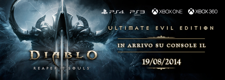 Il 19 agosto, l'Angelo della Morte arriverà sulle console di tutto il mondo con il lancio di Diablo® III: Reaper of Souls™ - Ultimate Evil Edition™ per PS3™, PS4™, Xbox 360® e Xbox One®. Prepara il tuo salotto, nefilim, perché prima che l'estate finisca dovrai affrontare la Morte stessa... ma potrai avere fino a tre amici al tuo fianco, direttamente sul tuo televisore!