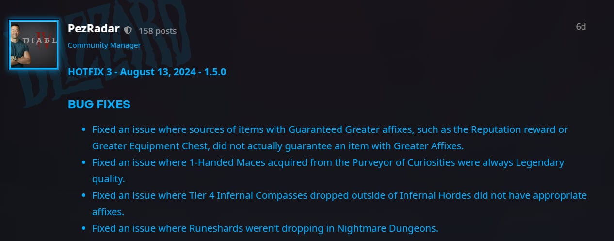 “Corretto un problema per cui le fonti di oggetti con affissi garantiti maggiori, come la ricompensa della reputazione o il Forziere dell’equipaggiamento maggiore, non garantivano effettivamente un oggetto con affissi maggiori.”