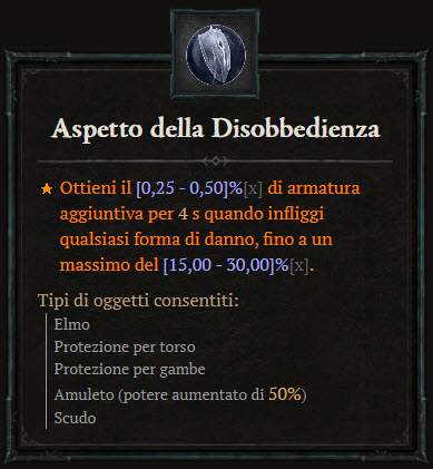 Accumuli massimi dell’Aspetto della Disobbedienza ridotti da 100 a 60, dunque il bonus all’armatura massimo è stato ridotto dal 25-50% al 15-30%.